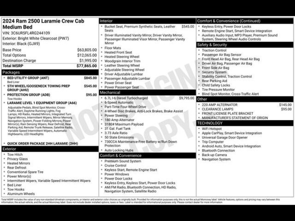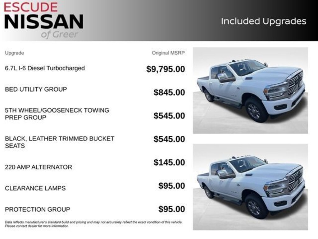 Boasting the legendary Cummins 6.7L I6 Turbodiesel engine, this Ram 2500 Laramie delivers unparalleled power and efficiency. Paired with a smooth-shifting 6-speed automatic transmission and robust 4-wheel drive system, you'll conquer any terrain with confidence. Whether hauling heavy payloads or towing your most demanding equipment, this truck is engineered to handle it all with ease.